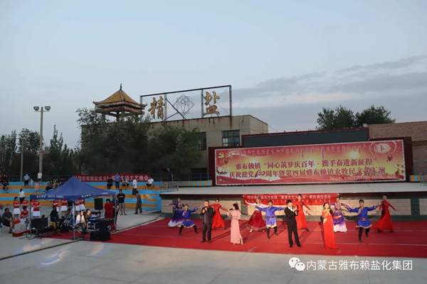 7月8日晚,阿右旗烏蘭牧騎走進(jìn)雅鹽化集團(tuán)公司,與企業(yè)聯(lián)合舉辦消夏暨慶祝雅鹽建場(chǎng)80周年文藝晚會(huì)。